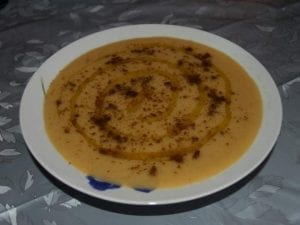تقدم البصارة ساخنة مرافقة بزيت الزيتون ، والفلفل الحلو والكمون